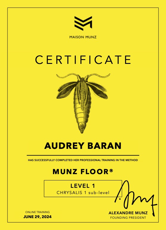 I am certified by MAISON MUNZ, the parent company and only international organization authorized to train and certify professionals to the MUNZ FLOOR® method, which was developed in 2004 by former Principal dancer Alexandre Munz. MUNZ FLOOR® has received awards and honors from the French and American governments, and in 2011 it was the subject of a scientific experiment funded by the French government. From personal experience, I can attest that this approach triggers ‘’The Extraordinary Power of Our Fascia in Motion.’’